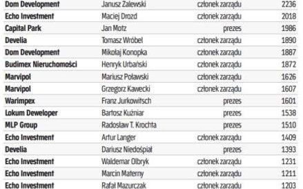 Niewiele zabrakło, by w rankingu znalazła się jeszcze jedna kobieta, Zofia Egierska, – prezes i główna akcjonariuszka ED Investu, dewelopera specyficznego, bo budującego mieszkania głównie na zamówienie warszawskich spółdzielni. Wynagrodzenie w 2020 r. wyniosło 0,97 mln zł, a jako akcjonariuszka Egierska otrzymała jeszcze prawie 1,3 mln zł dywidendy.