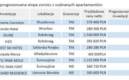 Przypomina, że są dwa sposoby rozliczeń między operatorem a właścicielem lokalu. - W przypadku opcji z gwarancją właściciel apartamentu uzyskuje stałą stopę zwrotu. Na wysokość zysku nie ma wpływu obłożenie hotelu. Pieniądze są wypłacane w cyklach miesięcznych, kwartalnych bądź rocznych - wyjaśnia ekspert Domiporty.pl. - Gwarantowana stopa zwrotu wyraźnie przewyższa dzisiejsze oprocentowanie lokat bankowych, które we wrześniu wyniosło 1,7 proc.