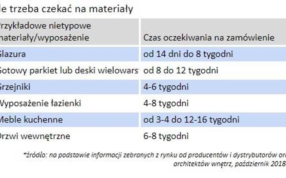 Dodaje, że unikniemy takich kłopotów, gdy wybierzemy wersję pod klucz u dewelopera, który współpracuje z firmami remontowymi i to nim spoczywa obowiązek sprawdzenia ich dostępności, a potem kontrola przeprowadzanych przez nich prac. - Również architekci współpracują z zaprzyjaźnionymi fachowcami, co może ograniczyć ryzyko, że znikną z dnia na dzień - mówi Beata Zielińska. Co z materiałami potrzebnymi do wykończenia mieszkania? - Są materiały, które teoretycznie możemy dostać od ręki, czyli w ciągu kilku dni od zamówienia, ale raczej trzeba się liczyć z tym, że będziemy musieli poczekać kilka tygodni, a nawet kilka miesięcy - nie ukrywa. - Dotyczy to w szczególności produktów rzadkich, sprowadzanych z zagranicy czy zamawianych w wersji niestandardowej. Nawet 16 tygodni czeka się na meble kuchenne, gdy wybierzemy na przykład droższe szafki z frontami w wersji fornirowanej. W cierpliwość trzeba się też uzbroić przy zamawianiu podłogi ściąganej z zagranicy. Odbierzemy ją zwykle nie szybciej niż po ośmiu tygodniach. Na drzwi wewnętrzne dopasowane do naszych wymagań zarówno pod względem wymiarów, wykończenia, kolorystyki, jak i wyposażenia poczekamy od sześciu do ośmiu tygodni. Mniej więcej tyle samo czeka się na zamawiane z katalogu płytki zagraniczne. Jeśli chodzi o wyposażenie łazienki to, gdy zamarzy się nam wanna z hydromasażem lub nietypowa kabina prysznicowa poczekamy na dostawę od czterech do pięciu tygodni - podaje.
