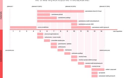 Na powstanie projektu koncepcyjnego (zawiera zwykle rzuty płaskie, na których jest pokazany układ funkcjonalny mieszkania) potrzeba zwykle dwóch - trzech spotkań ze specjalistą. Potem powstaje projekt wykonawczy ( (zawarte są w nim m.in. wytyczne dla fachowców odnośnie do instalacji elektrycznej i wodno-kanalizacyjnej oraz rysunki zabudowy kuchennej). - Opracowanie tych projektów zajmuje nie mniej niż cztery tygodnie - szacują eksperci Domiporty.pl.
