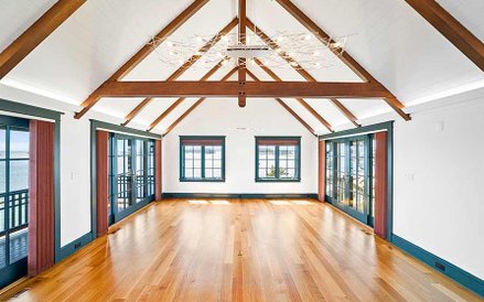 Dom jest jasny i przestronny, ma duże okna sięgające od podłogi do sufitu oraz eleganckie drewniane podłogi. Wokół domu jest zadaszony taras z którego można podziwiać widok na cały Long Island Sound.