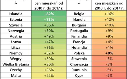 Ekspert dodaje, że pod względem dynamiki cen mieszkań pomiędzy 2010 a 2017 rokiem Polska znajduje się na 22. miejscu wśród 28 analizowanych państw. - Niżej od naszego kraju znalazły się tylko państwa, w których ceny mieszkań spadły względem 2010 r. (Słowenia, Chorwacja, Rumunia, Cypr, Włochy, Hiszpania) - zwraca uwagę. - Wyraźne spadki cen mieszkań (o 16 - 17 proc.) na dużym hiszpańskim i włoskim rynku obniżają dynamikę obliczoną dla całej UE. Na poziom indeksu cenowego dla całej Unii Europejskiej negatywnie wpływa też niewielki wzrost cen mieszkań z Francji (tylko 4 proc. pomiędzy 2010 r. a 2017 r.). Warto również odnotować, że największe siedmioletnie wzrosty cen (47 - 82 proc.) odnotowano w krajach, które nie są liderami pod względem liczby sprzedawanych nieruchomości. Mowa o Islandii, Estonii, Szwecji, Norwegii, Austrii oraz Łotwie.