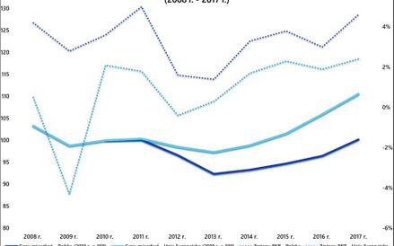 Eksperci RynkuPierwotnego.pl w ramach porównania uwzględnili również analogiczny indeks cen mieszkań dotyczący całej Unii Europejskiej. - W przypadku obydwu indeksów jako punkt odniesienia (poziom indeksów równy 100) przyjęliśmy rok 2010 - wyjaśnia Andrzej Prajsnar. - Dołączony wykres prezentuje również zmiany tempa wzrostu gospodarczego w Polsce i całej UE. Uwzględnienie takich wahań PKB jest zasadne, bo wykazują one pewną korelację z cenami mieszkań. Nietrudno zauważyć związek pomiędzy recesją gospodarczą w Unii Europejskiej z końca minionej dekady oraz spadkiem cen mieszkań notowanym dla całej wspólnoty. Drugie wyraźne pogorszenie koniunktury odnotowaliśmy w 2012 r. Było ono widoczne zarówno w Polsce jak i Unii Europejskiej - przypomina.