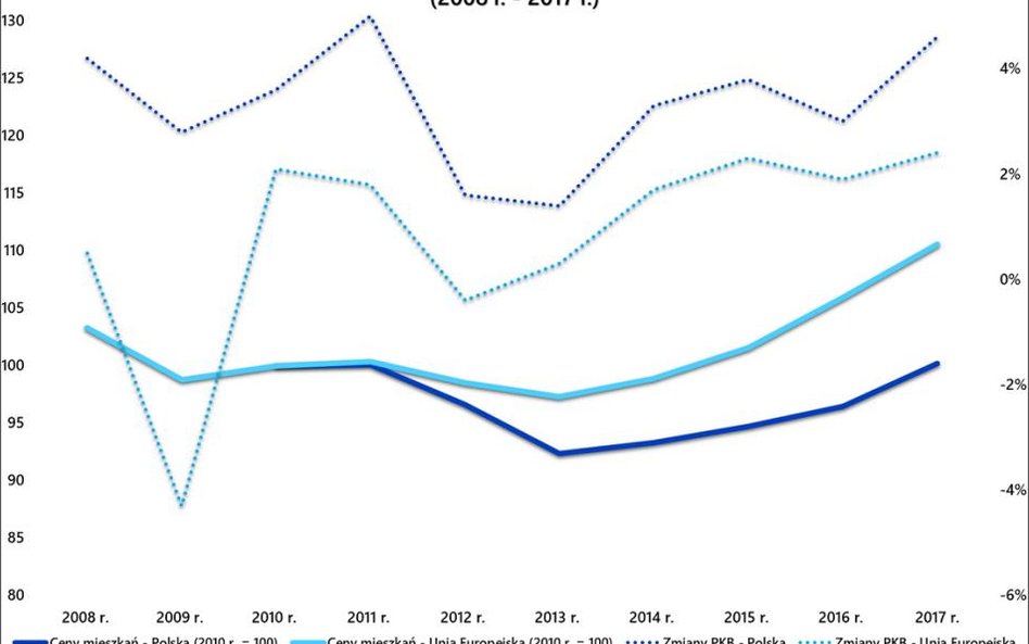 - Ceny mieszkań w Polsce i całej Unii Europejskiej zaczęły wyraźnie rosnąć po 2013 roku. Miało to związek z poprawą koniunktury gospodarczej - opowiada Andrzej Prajsnar. - Dzięki tym podwyżkom ceny unijnych mieszkań w 2017 r. były o 11 proc. wyższe w stosunku do wyniku sprzed siedmiu lat. W przypadku Polski analizowany indeks cenowy dla 2017 r. wynosi natomiast 100. To oznacza brak zmiany cen mieszkań w stosunku do 2010 r. Wynik dotyczący Polski ma związek z tym, że korekta cen nieruchomości mieszkaniowych z lat 2012 - 2013 była głębsza niż w całej UE - wyjaśnia.