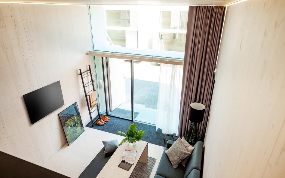 Część sypialna na antresoli jest mniejsza, tam wysokość nie przekracza 2 metrów. Dom dysponuje także niewielkim tarasem.