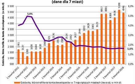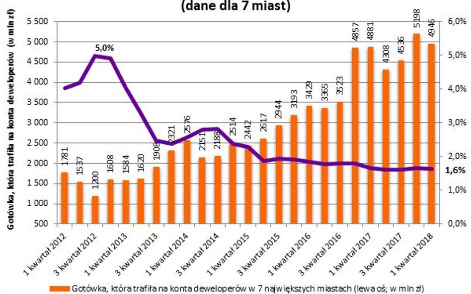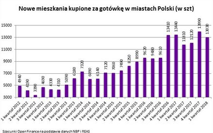 Hossa na rynku mieszkaniowym trwa. Polacy wciąż szturmują biura sprzedaży deweloperów, chcąc kupić mieszkania. Robią to na własne potrzeby jak i z myślą o czerpaniu zysków z wynajmu. Najbardziej zaskakuje jednak, że wciąż ponad 70 proc. kupujących płaci gotówką. Prawie 5 mld zł gotówki wyciągnęli „ze skarpet" Polacy, aby kupić nowe mieszkania – wynika z najnowszych danych Narodowego Banku Polskiego. Wynik o tyle zaskakujący, że dotyczy jedynie pierwszego kwartału 2018 roku, siedmiu miast Polski i mieszkań sprzedawanych przez deweloperów. Warto dodać, że taka kwota wystarczyłaby na zakup ponad 13 tysięcy mieszkań. Co niemniej ciekawe, wciąż Polacy kupują mieszkania przede wszystkim za gotówkę.