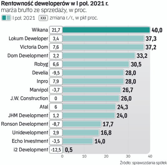 Najwyższą średnią marżę, równą 40 proc., zanotowała budująca w południowo-wschodniej Polsce Wikana, choć trzeba wziąć poprawkę na to, że na wynik zapracowała jedna inwestycja. Duzi deweloperzy mają znacznie bardziej rozbudowane portfele, co oznacza większe zróżnicowanie marż na poszczególnych projektach.