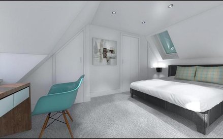 Na dole znajduje się salon z aneksem kuchennym i niewielka toaleta oraz schowek-szafa pod schodami. Na pietrze są duża sypialni i łazienka z prysznicem oraz szafy wnękowe. Apartament wyposażony jest w ogrzewanie podłogowe. Okna sypialni wychodzą na park otaczający centrum kulturalne Bourne Hall. Na pierwszym poziomie jest też wyjście do niewielkiego ogródka należącego do apartamentów.