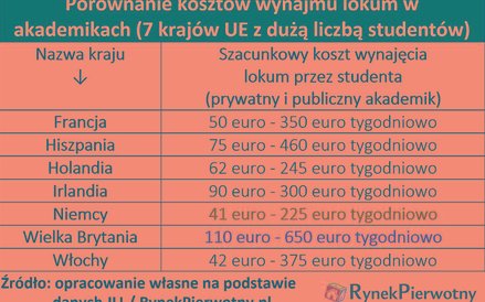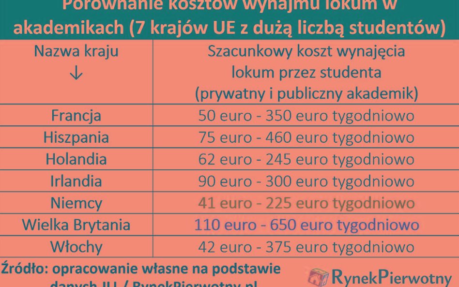 Niemcy to kraj będący najbliższym wyborem dla młodych Polaków, którzy chcą studiować w Europie Zachodniej. Z punktu widzenia studentów ważną kwestią są również koszty zakwaterowania. Dane firmy Jones Lang LaSalle (JLL) wskazują, że w Niemczech koszt wynajmu lokum w akademiku jest relatywnie niski (41 euro - 225 euro tygodniowo). Znacznie wyższy poziom stawek za wynajem notują m.in. Włochy, Hiszpania, Francja oraz Wielka Brytania. Relatywnie niskie koszty studenckiego lokum w Niemczech są związane z dobrze rozwiniętym rynkiem najmu.