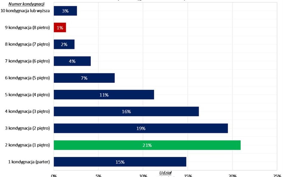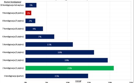 Poniżej trzeciego piętra znajduje się ponad połowa lokali deweloperskich. Na portalu RynekPierwotny.pl jest ponad 60 tys. ofert lokali mieszkalnych, które zostały wystawione na sprzedaż przez deweloperów. To ok. 70 - 80 proc. krajowego rynku pierwotnego. Okazuje się, że najwięcej (21 proc.) lokali zostało usytuowanych na drugiej kondygnacji (pierwsze piętro). Stosunkowo popularne są też mieszkania położone na: