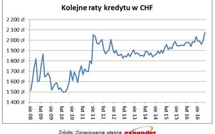 Przypomnijmy: w ostatni piątek (2 grudnia) kurs franka szwajcarskiego wzrósł do poziomu 4,16 zł. - Oznacza to, że rata kredytu w CHF spłacana właśnie tego dnia mogła być największą w historii. Mimo że wcześniej zdarzały się wyższe kursy, to jednak nigdy nie występowały w pierwszych dniach miesiąca - komentuje Jarosław Sadowski, główny analityk firmy Expander.