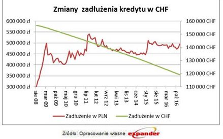Z jego wyliczeń wynika, że w przypadku zobowiązania w wysokości 300 tys. zł z sierpnia 2008 r., rata płacona przy takim kursie wyniosła 2073 zł i była o 557 zł wyższa niż zaraz po zaciągnięciu kredytu.