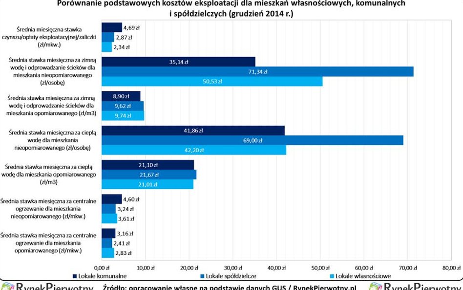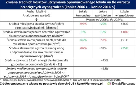 Duża różnica dotyczyła tylko kosztów utrzymania i administracji budynku. Od końca 2006 roku do końca 2014 roku, średni czynsz w mieszkaniach komunalnych wzrósł o 93 proc. Analogiczna zmiana dla lokali spółdzielczych i własnościowych wyniosła odpowiednio 29 oraz 36 proc.