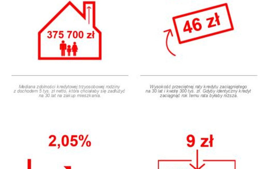 Podkreśla, że pierwszą faktyczną przyczyną jest najprawdopodobniej utrzymywanie się problemu z uzyskaniem kredytu na budowę domu na działce rolnej. - Przypomnijmy, że ustawa o obrocie gruntami spowodowała, że taka działka nie jest wystarczającym zabezpieczeniem dla kredytu. Banki zaczęły więc wymagać dodatkowych zabezpieczeń np. mieszkania - mówi Jarosław Sadowski. - Wiele osób nie jest w stanie jednak takiego wymagania spełnić i wstrzymuje się z budową. Na szczęście Sejm uchwalił już nowelizację ustawy, która ma usunąć ten problem. Kolejnym powodem może być znaczący spadek dostępności kredytów. Dla przykładu - rodzina z dochodem wynoszącym 5 tys. zł netto ma dziś zdolność kredytową aż o prawie 100 tys. zł niższą niż przed rokiem - szacuje.