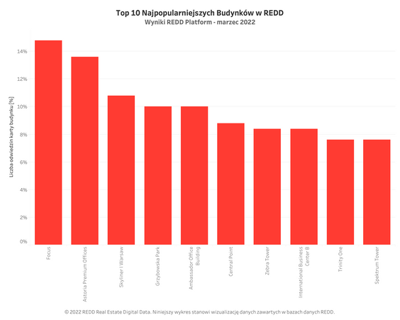 Focus, Astoria Premium Offices, Skyliner I Warsaw – to TOP3 najczęściej przeglądanych ofert biurowców w marcu. Tak wynika z danych platformy REDD, która oferuje narzędzie REDD 3.0, pozwalające śledzić zainteresowanie budynkami. Aplikacja pokazuje, ile osób otworzyło ofertę biur, ile czasu ją przeglądano, co najbardziej interesuje najemców, jakie zdjęcia nieruchomości przykuwają uwagę.