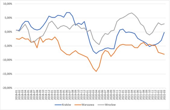 Ekspert obido.pl zauważa, że w Krakowie sytuacja ostatnio się poprawia. - Ale z trzech badanych miast najlepiej jest we Wrocławiu. Za średnią cenę kawalerki w Warszawie można tam kupić lokal trzypokojowy – mówi Marcin Krasoń. – Jeśli wstrzymanie się z transakcjami będzie czasowe, jak na początku pandemii, drugi kwartał powinien pokazać ożywienie sprzedaży. Ale bez względu na jej poziom, trudno się spodziewać spadków cen w czasie, gdy niemal wszystko w Polsce drożeje i to często o kilkanaście procent rocznie – zastrzega.