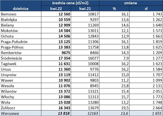 - Z analizy cen ofertowych mieszkań wystawionych do sprzedaży w serwisach Morizon.pl i Gratka.pl w kwietniu wynika, że jedyną dzielnicą, w której metr używanego lokalu jest wyceniany poniżej 10 tys. zł za metr (ponad 9,6 tys. zł) pozostaje Rembertów – mówi Marcin Drogomirecki. – W 10 na 18 dzielnic stolicy średnie ceny ofertowe przekroczyły próg 13 tys. zł za metr. Średnia dla całego miasta wzrosła w ciągu roku o 13,6 proc. W kwietniu wyniosła 13,8 tys. zł.