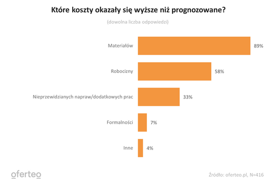 Analitycy serwisu podkreślają, że ubiegły rok upłynął pod znakiem rosnących kosztów budowy. - Z tego powodu szacunkowe wyceny nie zawsze znajdowały odzwierciedlenie w rzeczywistości. Dla niemal 77 proc. Polaków ostateczny koszt budowy był wyższy niż zaplanowany na starcie inwestycji. Zaledwie 5 proc. osób wydało na budowę mniej niż wcześniej zakładano – czytamy w raporcie. – Dodatkowe nieoczekiwane koszty dotyczyły najczęściej materiałów budowlanych. Zasygnalizowało to 89 proc. osób, które ostatecznie zapłaciły za materiały więcej niż planowały. We znaki dała się im również podwyżka stawek za robociznę (58 proc.) oraz nieprzewidziane, dodatkowe naprawy i prace (33 proc.). Wzrost kosztów wynosił zazwyczaj ok. 20 proc. względem całości szacowanego budżetu.