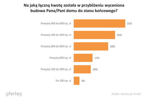 Ankietowani wskazali, że za budowę domu planowali najczęściej zapłacić 400 - 600 tys. zł. - W tym przedziale znalazło się niemal 31 proc. wszystkich inwestycji. Budżety 200 – 400 tys. i 600 – 800 tys. zł stanowiły odpowiednio 25 i 20 proc. – wskazują autorzy raportu Oferteo.pl. - Najmniej wycen znalazło poniżej 200 tys. (13 proc.) i powyżej 800 tys. (11 proc.).