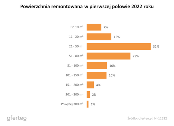 W pierwszej połowie tego roku zlecenia najczęściej dotyczyły powierzchni od 21 do 50 mkw. – o remont takiego metrażu pytało 23 proc. inwestorów. – Remonty były też często planowane na powierzchniach 51–80 mkw. (22 proc.) oraz 11–20 mkw. (12 proc.) – wskazują autorzy raportu.