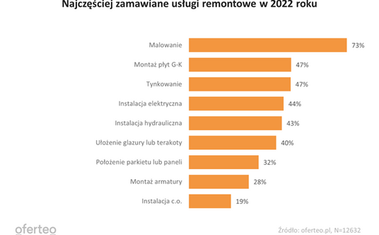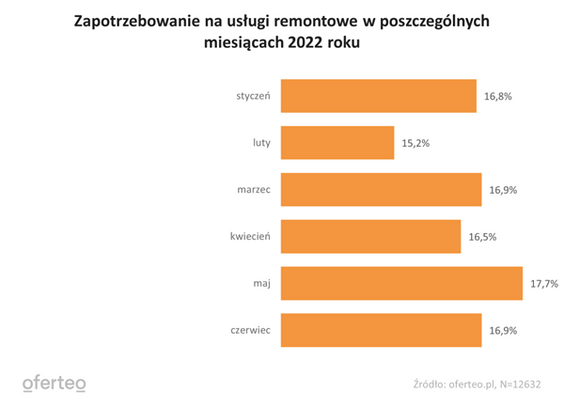 Z danych serwisu Oferteo.pl wynika, że prace remontowe są najczęściej zlecane w maju (17,7 proc.), najrzadziej w lutym (15,3 proc.). – Niemal 40 proc. osób planujących remont było gotowych na rozpoczęcie prac natychmiast. 17 proc. podjęło się poszukiwania ekipy z miesięcznym wyprzedzeniem, a 21 proc. – na ponad trzy miesiące przed planowanym startem renowacji – czytamy w raporcie.