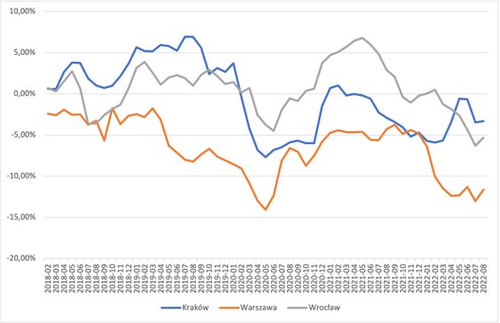 Krasoń dodaje, że sierpniowy odczyt barometru nastrojów na rynku mieszkaniowym przygotowywanego dla „Nieruchomości" „Rzeczpospolitej" przez JLL i obido wskazuje „na sygnały odbicia". - Ceny mieszkań przestały rosnąć, a kupujący spodziewają się końca wzrostu stóp procentowych. Niezmiennie najtrudniejsza sytuacja jest w Warszawie, choć od kilku miesięcy się ona nie pogarsza – mówi Marcin Krasoń.