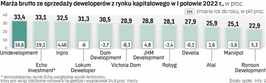 W I połowie br. dwunastu deweloperów notowanych na GPW i Catalyst uzyskało wysoką średnią marżę brutto ze sprzedaży 29 proc. – o 2,6 pkt proc. więcej niż rok wcześniej. Mediana zwiększyła się o 1,6 pkt proc., do 28,9 proc.