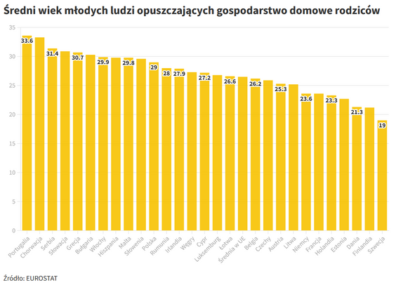 Ekspert Metrohouse przywołuje wyniki badań Eurostatu za 2021 r. dotyczące średniej wieku, w którym młodzi ludzie opuszczają rodzinne domy. – W Polsce ten wiek wynosi 29 lat. Jeżeli dotychczasowe zjawiska (drogie i niedostępne kredyty, rosnące ceny mieszkań, brak budownictwa społecznego i systemowych rozwiązań dla osób nabywających swoje pierwsze mieszkanie), się pogłębią, to można się spodziewać, że szybko dogonimy liderów tego rankingu, czyli takie kraje jak Portugalia czy Chorwacja, gdzie idziemy „na własne" w wieku 33 lat - mówi Marcin Jańczuk. - Podobnie jak w Polsce sytuacja wygląda w Słowenii czy Rumunii, ale też w Hiszpanii i we Włoszech, gdzie mieszkanie z rodzicami doczekało się nawet odrębnego terminu - „bamboccioni".