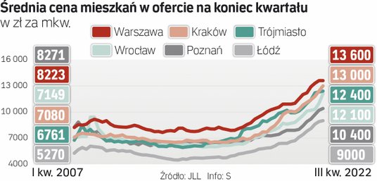 Autorzy prognozy podają, powołując się na dane NBP, że od IV kw. 2021 r. do III kw. br. przeciętna cena transakcyjna lokali w siedmiu miastach wzrosła o 10,9 proc., w tym o 4,5 proc. w I kw. 2022 r. Prognoza przedstawiona przez ekonomistów w kwietniu okazała się zbyt ostrożna – zakładali wzrost cen o 3 proc. kw./kw. w I kw. tego roku i ich stabilizację w kolejnych. Wyższa, niż zakładano, okazała się dynamika cen materiałów budowlanych, a niższa – stopa bezrobocia.