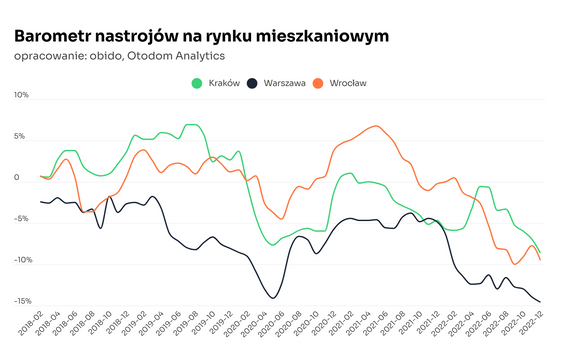 Ekspert zwraca uwagę, że w komfortowej sytuacji są osoby mające zdolność kredytową lub gotówkę. – Mają większy wybór – tłumaczy. Przygotowywany dla „Nieruchomości" „Rzeczpospolitej" barometr nastrojów na rynku mieszkań potwierdza te obserwacje. – Na wszystkich trzech badanych rynkach (Kraków, Warszawa, Wrocław) barometr jest w trendzie zniżkowym i jednocześnie na historycznie najniższych lub prawie najniższych poziomach – mówi Marcin Krasoń. - Nic dziwnego, bo średnia cena kawalerki w Krakowie i Wrocławiu to ok. 0,5 mln zł, a w Warszawie - ponad 550 tys. zł – wskazuje.