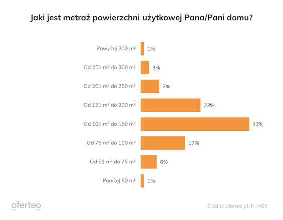 - Podobnie jak w zeszłym roku największa grupa respondentów (42 proc.) podała, że powierzchnia użytkowa ich domu mieści się w przedziale 101 – 150 mkw. Cześć osób zdecydowała się na większy metraż: od 151 do 200 mkw. (23 proc.). - Jeszcze większe domy, o powierzchni co najmniej 201 mkw., stanowiły 11 proc. nowo powstałych budynków – podają eksperci Oferteo.