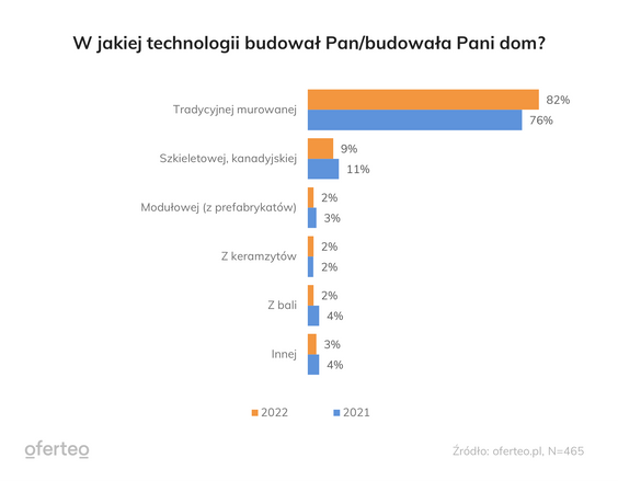 W tegorocznym raporcie przedstawiono wyniki badania przeprowadzonego przez portal Oferteo w styczniu 2023 roku wśród 465 osób, które budowały dom w 2022 roku.