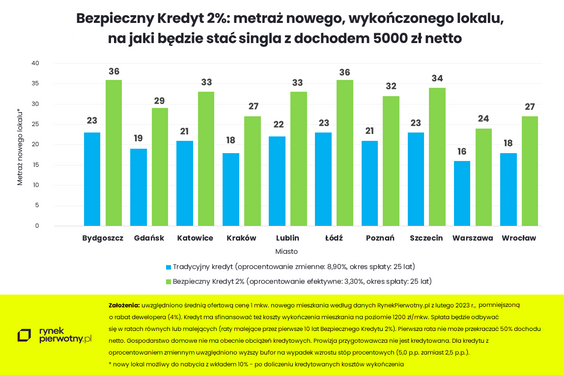 Wyliczenia dotyczące powierzchni nowego mieszkania, które można kupić za określoną kwotę, często pomijają koszty wykończenia takiego lokum. Tymczasem zakup „M" w stanie deweloperskim nadal jest bardzo popularnym rozwiązaniem. My postanowiliśmy uwzględnić w kalkulacjach koszt wykończenia na poziomie 1,3 tys. zł za mkw. Doliczenie tych kosztów do wykończenia oczywiście pomniejsza możliwą do zakupu powierzchnię przy określonej zdolności kredytowej. Takie założenie czyni jednak wyniki obliczeń bardziej realistycznymi.