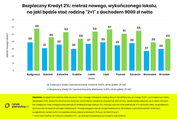 Zdolność kredytowa to dziś największy problem nabywców mieszkań. Z wyliczeń naszego portalu wynika, że program „Bezpieczny Kredyt 2 proc." powiększy tę zdolność nawet o 50 proc. Program przynajmniej częściowo skompensuje więc skutki szybkich wzrostów głównej stopy procentowej NBP i WIBOR-u. Większa zdolność kredytowa oznacza po prostu wzrost powierzchni mieszkania, które będzie można kupić na kredyt. Sprawdziliśmy, z jaką korzyścią wyrażoną w metrach kwadratowych może się wiązać skorzystanie z nowego programu dopłat.