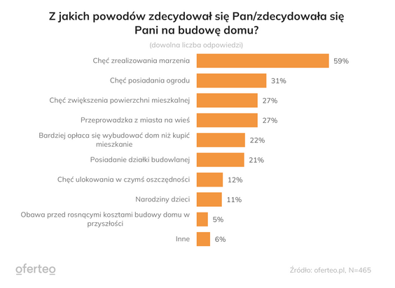 - Chęć realizacji marzeń to rokrocznie najważniejszy czynnik wpływający na decyzję o inwestycji w dom – mówią przedstawiciele serwisu Oferteop.pl. – Wśród budujących domy w 2022 roku na taką motywację wskazało prawie 50 proc. osób. W porównaniu z poprzednią edycją badania odsetek ten wzrósł o 7 pkt proc. Dla co trzeciej osoby istotną motywacją była chęć posiadania ogrodu.