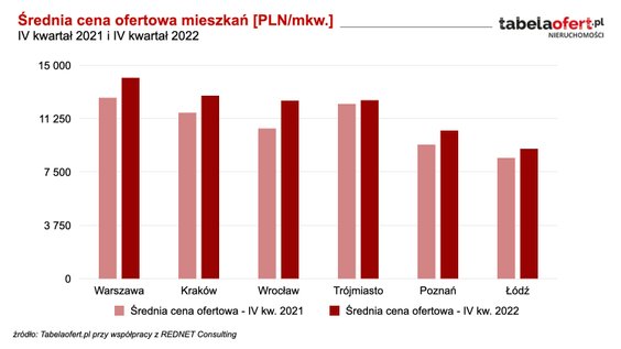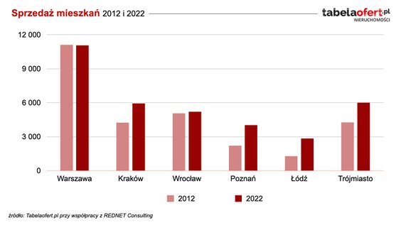 - Wydarzenia ostatnich kilkunastu miesięcy mocno wpłynęły na rynek mieszkań. Presja inflacyjna, a przede wszystkim ograniczenie dostępności kredytów przez wysoki poziom stóp procentowych sprawiły, że sprzedaż nowych mieszkań w sześciu największych miastach spadła w 2022 r. o 45 proc. (licząc rok do roku) – podają analitycy serwisu. – Największe spadki odnotowaliśmy we Wrocławiu (49 proc), najmniejsze w Poznaniu (40 proc.). Wróciliśmy do poziomów z 2013 r., a w przypadku Warszawy – nawet z 2012 r. Diametralnie inne wnioski przynosi analiza cen. Mieszkania kosztują dziś niemal dwa razy tyle co dziesięć lat temu, mimo że skumulowana inflacja w tym okresie wyniosła „jedynie" 36 proc.