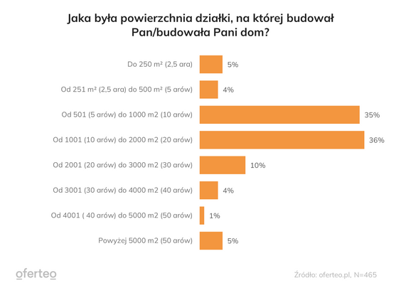 - Najczęściej inwestowano w duże działki budowlane. Największym zainteresowaniem cieszyły się parcele o powierzchni od 1 do 2 tys. mkw. Stanowiły one 36 proc. wszystkich transakcji – wskazują autorzy raportu Oferteo.pl. – Na działki od 500 do 1 tys. mkw. zdecydowało się 35 proc. ankietowanych. Rzadziej wybierano parcele od 2 do 3 tys. mkw. (10 proc.), do 250 mkw. (5 proc.) oraz od 250 do 500 mkw. (4 proc.).