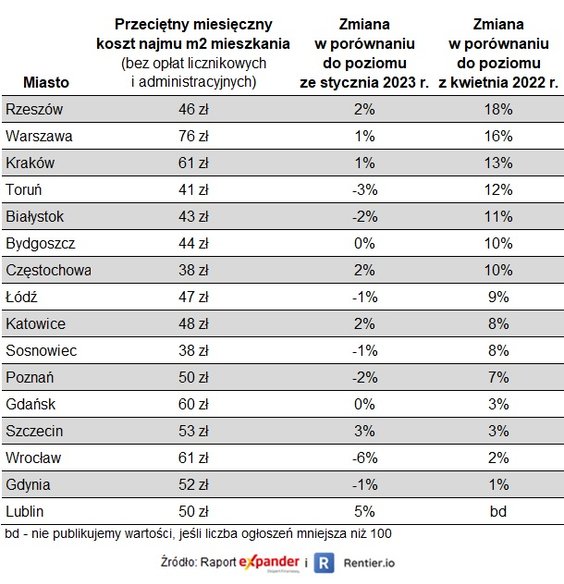 - Po dwóch miesiącach przewagi spadków na rynek najmu powróciły wzrosty. W kwietniu najem zdrożał w dziesięciu miastach, w pięciu koszty najmu spadły, a w jednym mieście pozostały na poziomie z marca – wynika z raportu Expandera i Rentier.io. – W porównaniu z czynszami sprzed roku, stawki w badanych miastach są wyraźnie wyższe, średnio o 8,8 proc. Liczba dostępnych ofert najmu w badanych miastach (35 tys.) w porównaniu z marcem nieco spadła. Wciąż jednak można bez problemu znaleźć odpowiednie mieszkanie.