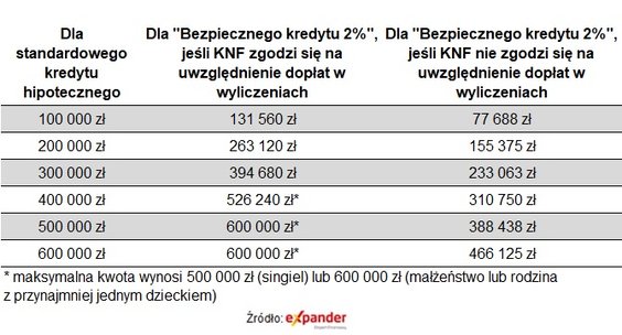 Z wyliczeń Expandera wynika, że jeśli ktoś może dziś uzyskać 300 tys. zł zwykłego kredytu hipotecznego, to najprawdopodobniej będzie mógł dostać 394 tys. zł lub 233 tys. zł - w zależności od tego, jaką decyzję wyda KNF – tłumaczy analityk. Zauważa, że młodzi ludzie korzystający z tego programu nie będą mogli skorzystać z popularnego sposobu poprawy zdolności kredytowej, czyli dołączenia rodziców jako współkredytobiorców.