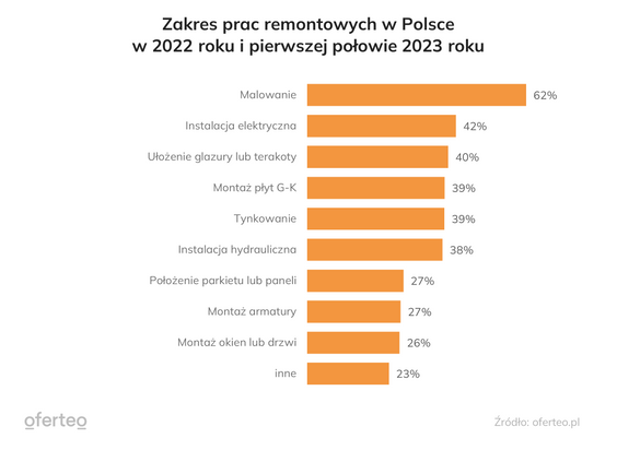 - Przeprowadzenie renowacji wiąże się często z zamówieniem usług malarskich. 62 proc. remontów (od początku 2022 roku do lipca tego roku) obejmowało, obok innych prac, malowanie ścian – wskazuje serwis. – Często zlecane są także modernizacja instalacji elektrycznej (42 proc.) i położenie glazury lub terakoty (40 proc.). Niektóre osoby, określając zakres prac, wymieniają też montaż płyt G-K oraz tynkowanie. Każda z tych usług była wyszczególniona w 39 proc. zleceń remontowych.