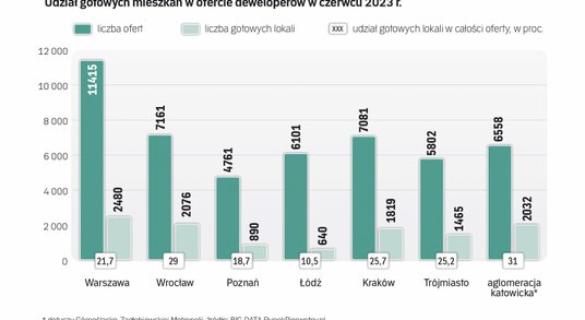 Portal podaje, że w Warszawie deweloperzy oferowali pod koniec czerwca ponad 11,4 tys. mieszkań, z czego gotowych – niespełna 2,5 tys. (21,7 proc.). We Wrocławiu cała oferta nowych lokali w tym czasie to ponad 7,1 tys. Gotowych – ponad 2 tys. (29,5 proc.). W Poznaniu było to ponad 4,7 tys. wszystkich, 890 gotowych (18,7 proc.), w Łodzi – 6,1 tys. i 640 (10,5 proc.), w Krakowie – niemal 7,1 tys. i 1819 (25,7 proc.), a w Trójmieście 5,8 tys. i 1,4 tys. (25,2 proc.). W aglomeracji katowickiej do kupienia było ponad 6,5 tys. lokali, z czego ukończonych – ponad 2 tys. (31 proc.).