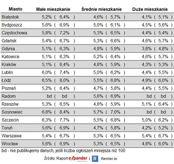Z analiz wynika, że najbardziej staniał najem mieszkań średniej wielkości i dużych. - Wyraźniejsze spadki stawek najmu widać w danych kwartalnych. Najbardziej tanieją mieszkania średniej wielkości (35-60 mkw.) - o 3,1 proc., licząc kwartał do kwartału – podają autorzy raportu Expandera i Rentier.io . – Niższe niż w pierwszym kwartale stawki odnotowaliśmy w 14 z 17 miast. W przypadku dużych mieszkań (powyżej 60 mkw.) spadki pojawiły się w 12 z 15 miast. Przeciętna zmiana to 3 proc. Najwolniej – o 1 proc. kwartał do kwartału, taniał najem małych mieszkań (do 35 mkw.). Spadki pojawiły się w 10 z 14 miast.