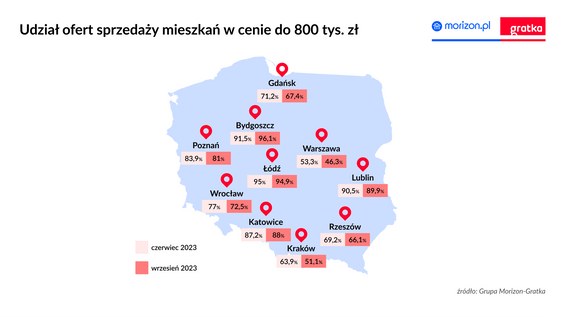 - Z naszych analiz wynika, że o ile w mniejszych miastach sytuacja jest w miarę stabilna, o tyle w tych największych (Warszawa, Kraków, Gdańsk, Wrocław) udział takich mieszkań w podaży ofert, które spełniałyby ustawowy wymóg cenowy, jest wyraźnie mniejszy niż jeszcze trzy miesiące temu – podkreśla Marcin Drogomirecki, analityk serwisów Morizon.pl i Gratka.pl - A mówimy o maksymalnym progu cenowym, czyli 800 tys. zł. W przypadku tańszych lokali, spadek udziału w podaży jest jeszcze bardziej odczuwalny – zaznacza.