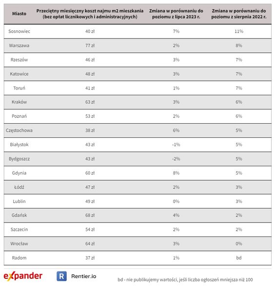 Analitycy Expandera i Rentier.io przypominają, że od października 2022 r. stawki najmu mieszkań były stabilne. - Czerwiec, lipiec i sierpień przyniosły jednak wzrosty. Początkowo były one niewielkie, ale w sierpniu nastąpiło wyraźne przyspieszenie – wzrost o 2,5 proc., licząc miesiąc do miesiąca – podają. – Czynsze za wynajmowane mieszkania wzrosły aż w 14 z 17 badanych miast. – Jest jednak za wcześnie, żeby ogłosić koniec stabilizacji i początek nowego trendu wzrostowego. Trzeba bowiem pamiętać, że sierpień jest specyficznym miesiącem. Poprzedza wrzesień, który jest zawsze najgorętszym okresem pod względem popytu na mieszkania. Lokali na kolejny rok akademicki szukają wtedy studenci. Sierpień jest więc czasem, kiedy wynajmujący mogą przetestować możliwość podwyższania cen. Jeśli nie znajdą chętnych, to we wrześniu będą musieli obniżyć stawki.