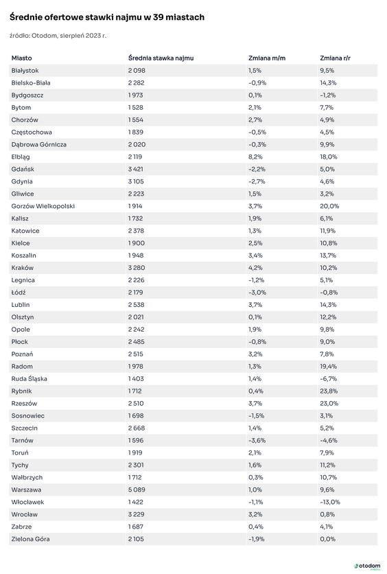 Z analiz Otodom Analytics wynika, że średnia ofertowa stawka najmu mieszkań w Warszawie to niemal 5,1 tys. zł miesięcznie (dane z końca sierpnia, za wrzesień jeszcze nie ma) - to 9,6 proc. więcej niż rok temu. W Krakowie przeciętny czynsz za wynajem lokalu wynosi prawie 3,3 tys. zł miesięcznie (10,2-proc. wzrost), w Poznaniu 2,5 tys. zł (7,8 proc.), w Lublinie – ponad 2,5 tys. zł (14,3 proc.). Taniej jest za to w Łodzi – w ciągu roku stawki najmu mieszkań w tym mieście spadły o ok. 1 proc., do niecałych 2,2 tys. zł miesięcznie. Studenci często wynajmują lokale w kilka osób, by podzielić koszty.