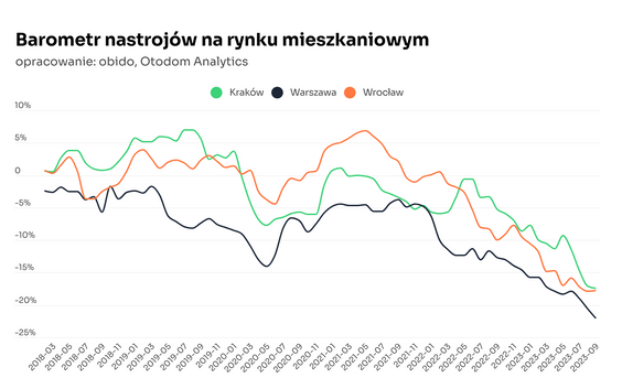 W tych okolicznościach, jak mówi analityk, spadki notowań barometru nastrojów na rynku mieszkaniowym przygotowywanego przez Otodom Analytics dla „Nieruchomości” „Rzeczpospolitej” nie mogą dziwić. – W Krakowie i we Wrocławiu wskaźnik jest na podobnym poziomie - pomiędzy 17 – 18 proc. W Warszawie sytuacja jest jeszcze trudniejsza, barometr spadł poniżej 22 proc. – wskazuje Marcin Krasoń.