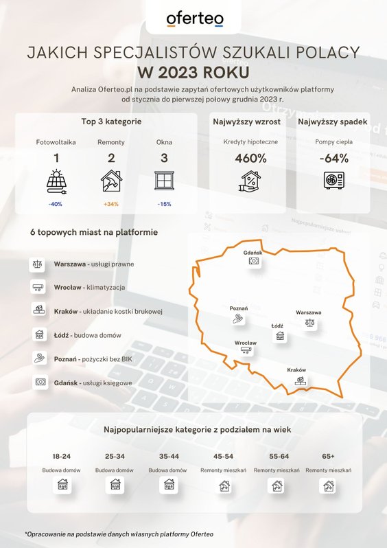 Serwis sprawdził, jakich specjalistów Polacy szukali w 2023 roku. W mijającym roku na platformie złożono ponad 1,8 mln pytań ofertowych dotyczących specjalistów z różnych dziedzin.