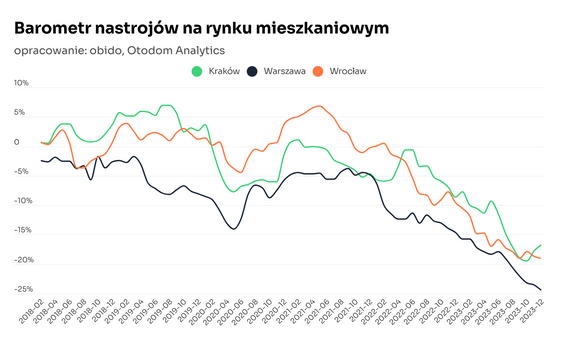 Jak mówi Marcin Krasoń, grudzień nie przyniósł rewolucji na rynku. – W największych miastach jak trudno było, tak jest, choć w notowaniach barometru nastrojów na rynku mieszkaniowym przygotowywanego przez Otodom Analytics dla „Nieruchomości” „Rzeczpospolitej” widać różnice na poszczególnych rynkach – zauważa ekspert. - W Warszawie grudzień był kolejnym miesiącem spadku wskaźnika. Oznacza to, że możliwości kupujących jeszcze bardziej rozjeżdżały się z cenami mieszkań w ofercie. W Krakowie i Wrocławiu kilka ostatnich miesięcy było okresem uspokojenia i względnej stabilizacji – dodaje.