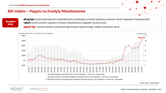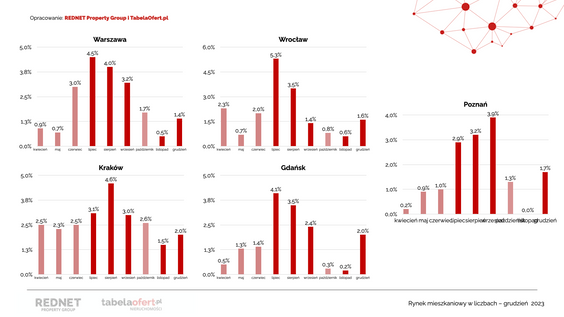 Z danych REDNET Property Group i portalu Tabelaofert.pl wynika, że koniec 2023 roku przyniósł bardziej dynamiczny wzrost cen mieszkań niż wcześniejsze miesiące. Budżet programu „Bezpieczny kredyt 2 proc.” był już bowiem na wyczerpaniu, klienci próbowali kupić lokal „rzutem na taśmę”.