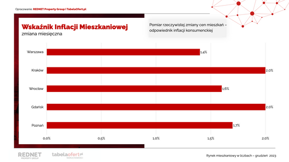 Opracowany przez REDNET Property Group i portal Tabelaofert.pl tzw. wskaźnik inflacji mieszkaniowej (WIM) ma pokazywać realne zmiany cen mieszkań deweloperskich. Eksperci analizują 10 proc. oferty mieszkań z pięciu miast – Warszawy, Krakowa, Wrocławia, Gdańska i Poznania, wyłączając apartamenty, których ceny zawyżają średnią cenę. Porównywane są typowe, łatwo zastępowalne w analizach mieszkania z segmentu popularnego i średniego.